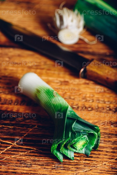 Свежий лук-порей на деревянном столе