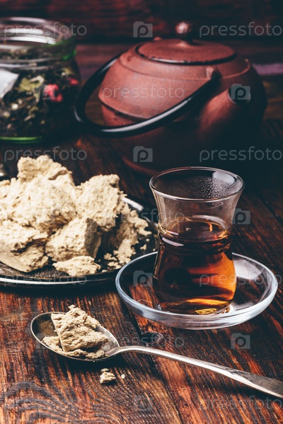 Черный чай в стакане армуду и ложка халвы