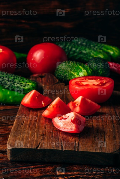 Нарезанные помидоры на разделочной доске и огурцы с перцем чили