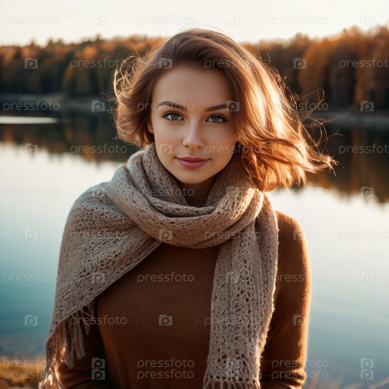 Красивая девушка с теплым шарфом на берегу осеннего озера. Девушка и осенний пейзаж