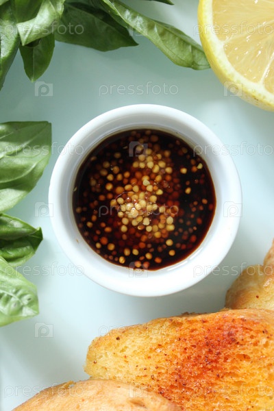 Соус из горчицы и винегрета с базиликом и лимоном для украшения хлеба