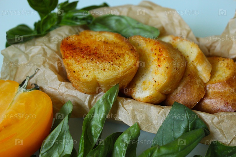Ломтики поджаренного хлеба со специями и листьями базилика на бумаге для выпечки
