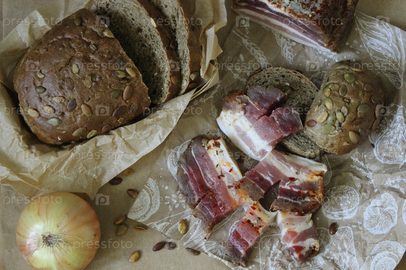 Ломтики домашнего бекона с тыквенным хлебом и луком на крафтовой бумаге