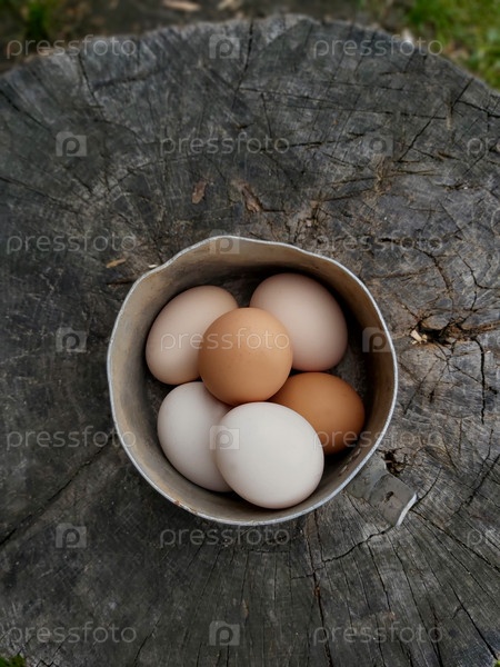 Свежие яйца в металлической кастрюле на деревенской деревянной поверхности
