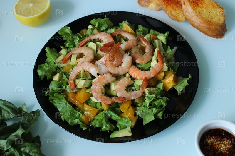 Салат из свежих креветок с авокадо, салатом и заправкой из желтого перца