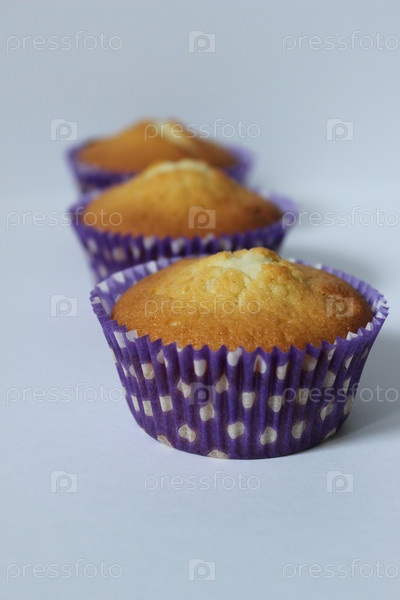 Вкусные золотистые кексы с фиолетовыми горошинами в формочках для выпечки, стоящие в ряд