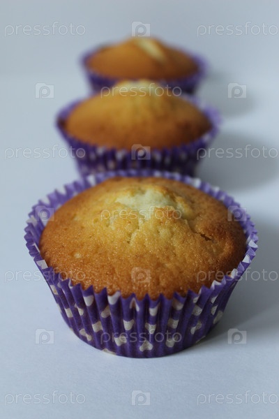 Вкусные золотистые кексы в фиолетовой обертке ждут, когда их съедят