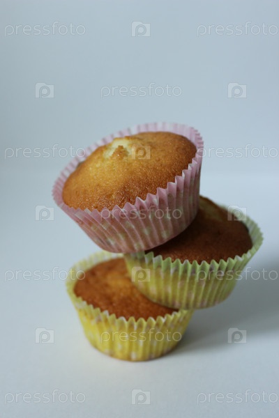 Три восхитительных золотистых кекса, балансирующих на белом фоне