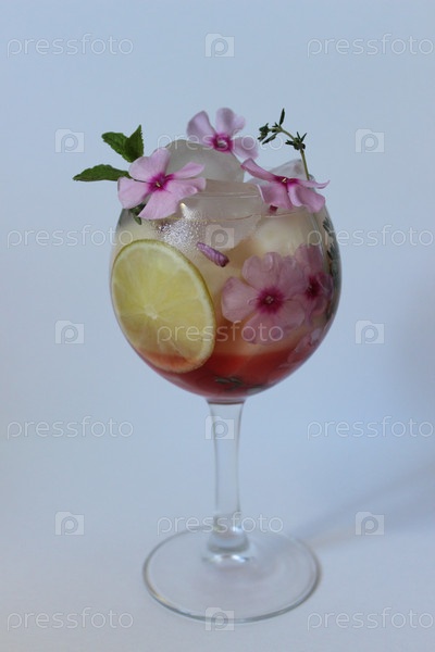 Освежающий летний коктейль, украшенный съедобными цветами и лаймом