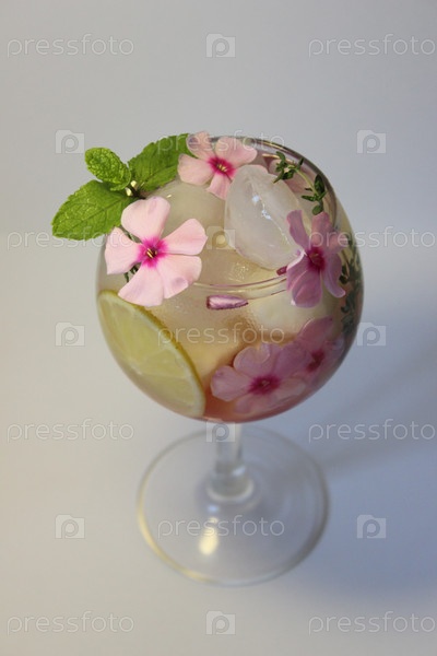 Освежающий летний коктейль, украшенный съедобными цветами и травами