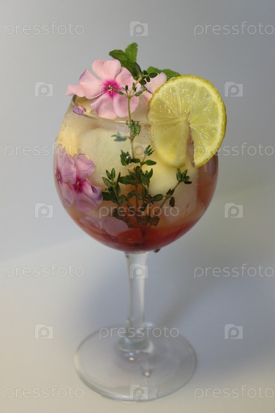 Освежающий летний коктейль, украшенный цветами и долькой лимона