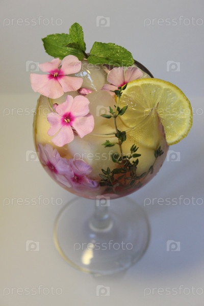 Освежающий летний коктейль, украшенный съедобными цветами, травами и долькой лимона