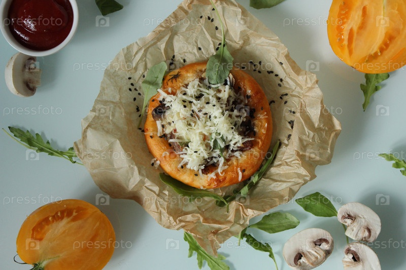 Мини-пицца с грибами, сыром и рукколой на бумаге для выпечки