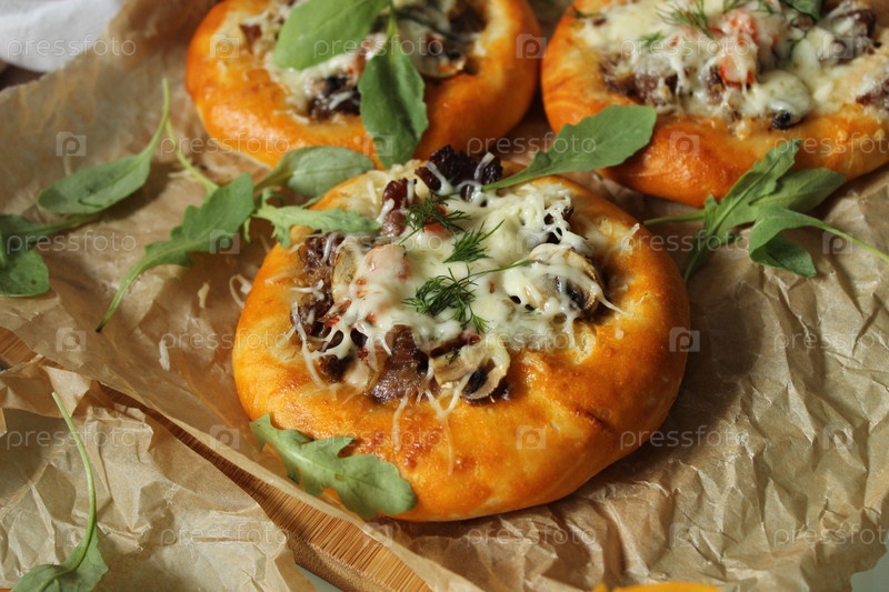 Мини-пиццы с грибами, луком и рукколой, лежащие на бумаге для выпечки