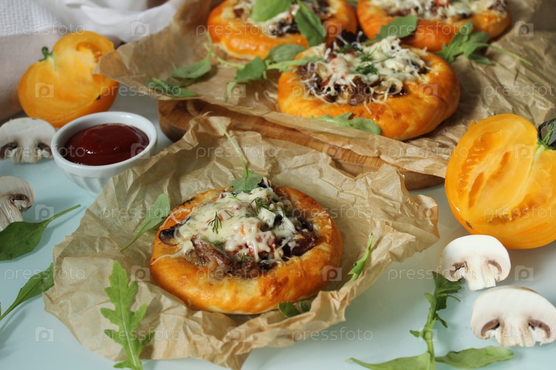 Мини-пиццы с грибами, сыром и зеленью, подаются на бумаге для выпечки