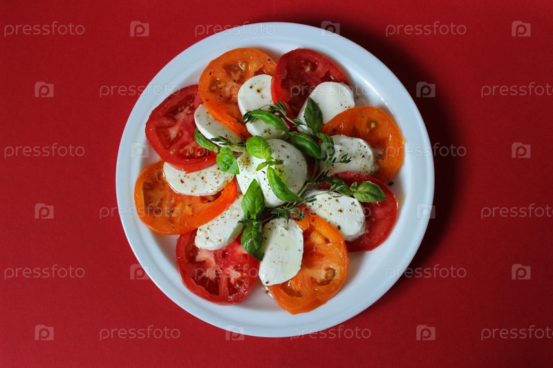 Вкусный итальянский салат капрезе с нарезанными помидорами и сыром моцарелла на красном фоне