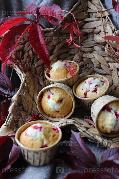 Вкусные клюквенные кексы в корзинке, украшенной осенними листьями
