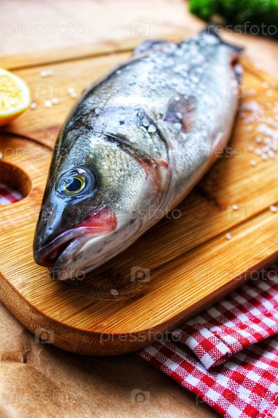 Сырой морской окунь, приправленный солью, с долькой лимона, готов к приготовлению