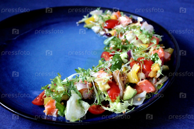 Салат из лосося, авокадо и помидоров, украшенный микрозеленью на синей тарелке