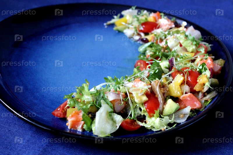 Салат из свежего лосося и авокадо с микрозеленью и горчичной заправкой на синей тарелке