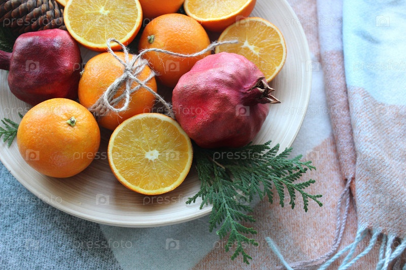 Свежие апельсины и гранаты с шишкой и веткой кипариса на деревянной тарелке