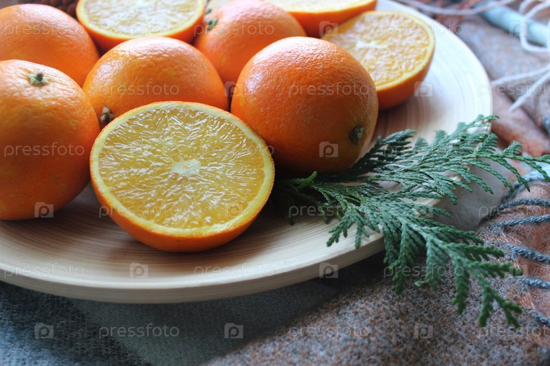 Свежие апельсины и веточка кипариса на деревянной тарелке на Рождество