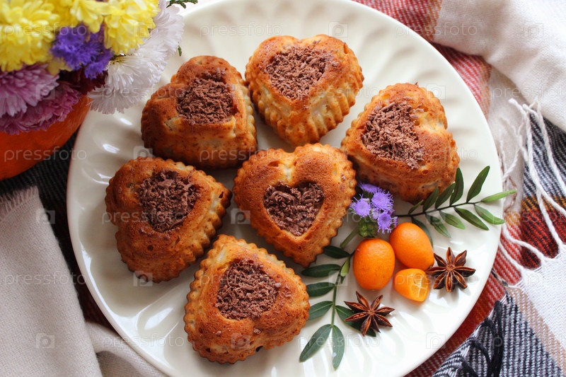 Маффины в форме сердца с шоколадной начинкой на белой тарелке