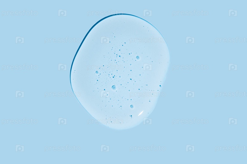 Крупным планом образцы жидкого косметического геля или сыворотки синего цвета с глянцевой, блестящей текстурой на гладком синем фоне