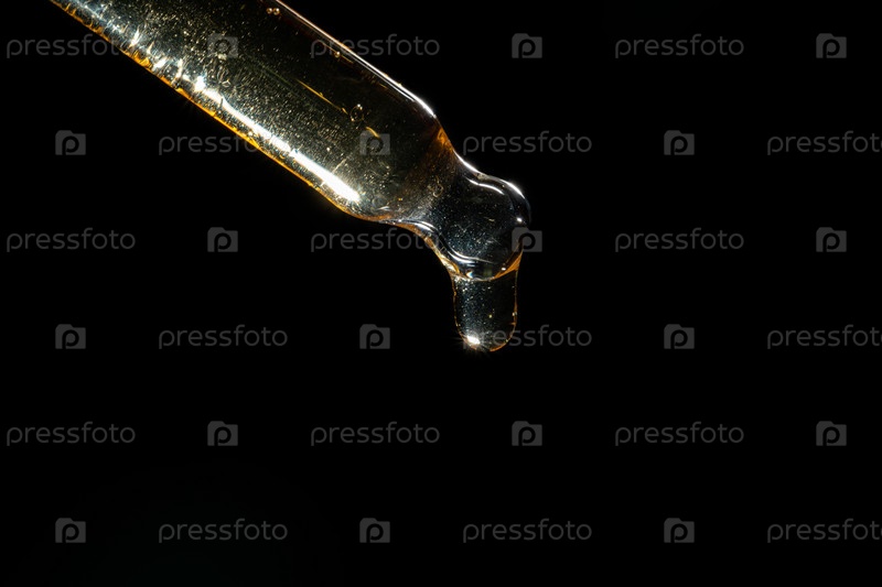 Золотая красота лица масло капает из пипетки на черном фоне. Реклама косметики по уходу за кожей с копировальным пространством