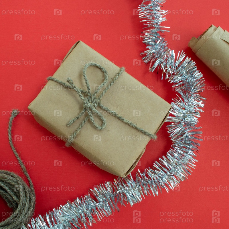 Упаковка новогодних подарков Подарок, шпагат, бумага и мишура на красном фоне