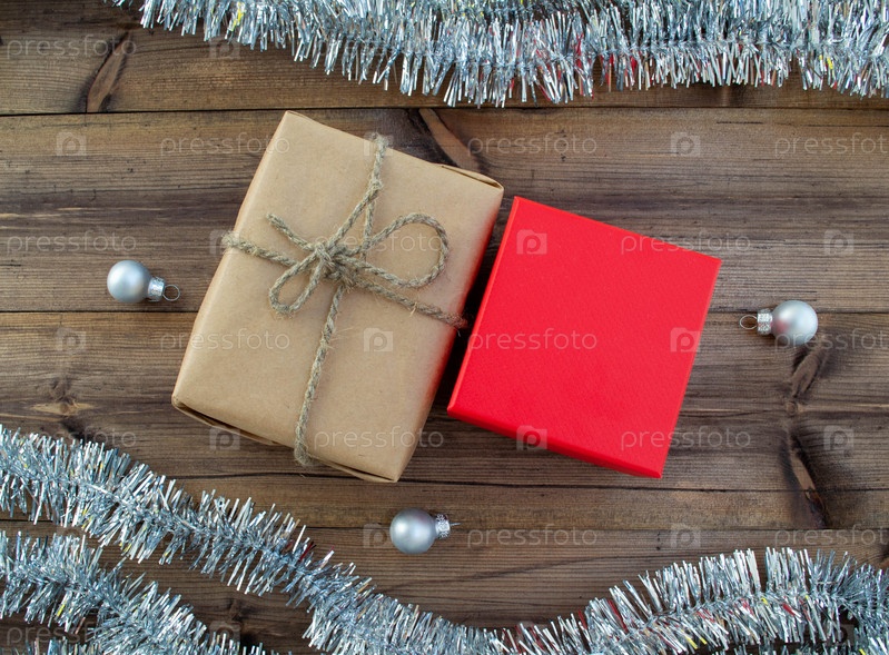 Рождественский фон. Рождественские подарки, елочные шары, мишура на деревянном фоне