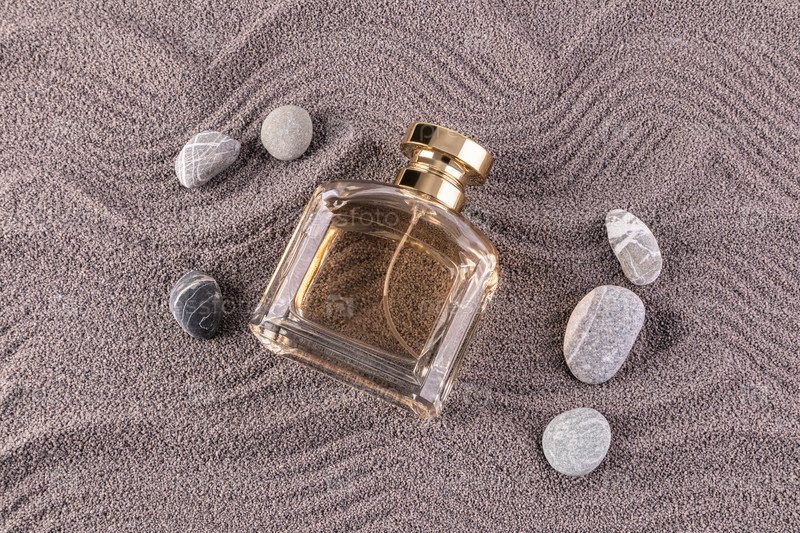 Шикарный флакон с золотым колпачком мужских духов на сером фактурном песке среди морской гальки. Пустой макет флакона. Презентация продукта. вид сверху