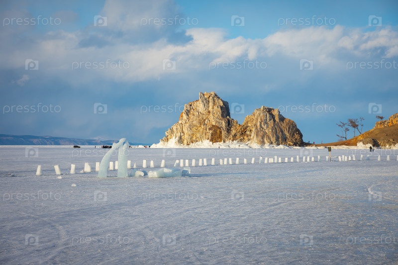 Небо облачное, солнце садится, создавая угрюмую атмосферу. Вид на гору Шаманка, озеро Байкал зимой