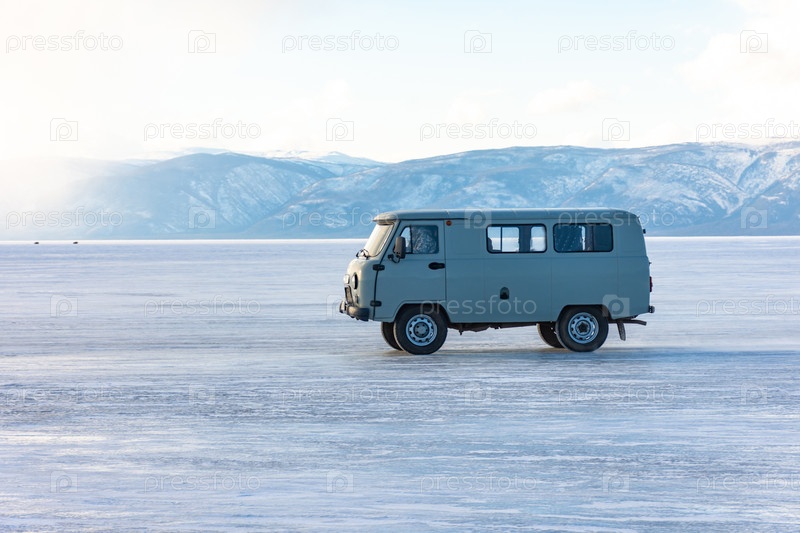 Белый фургон едет по заснеженной дороге