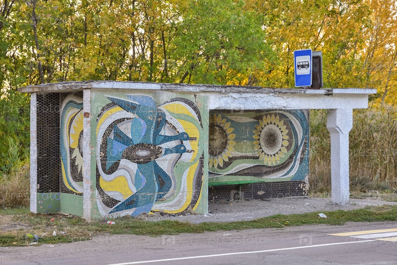 Автобусная остановка с фреской на стене