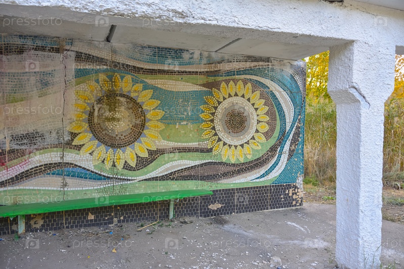 Автобусная остановка с фреской на стене