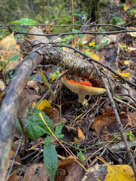 Группа красных и белых грибов растет в траве