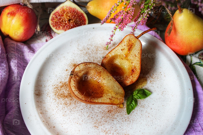 Две половинки запеченной груши с корицей, медом и базиликом на белой тарелке, украшенные свежими фруктами