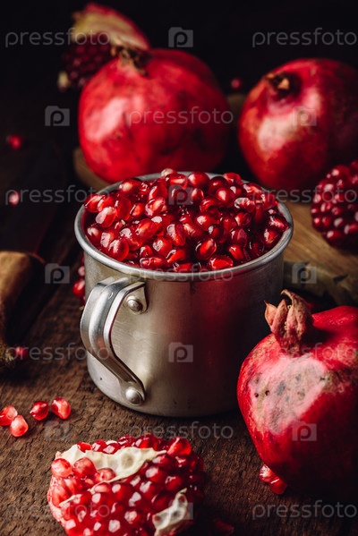 Металлическая кружка, полная гранатовых зерен