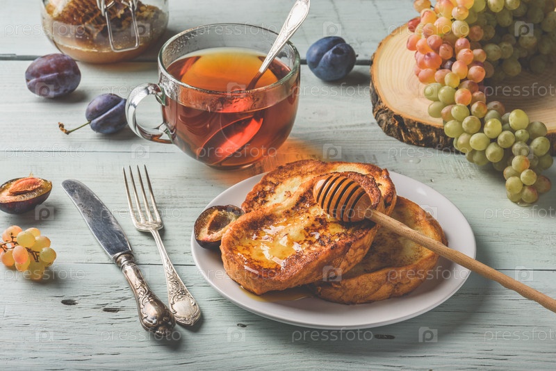 Французские тосты с медом, фруктами и чаем