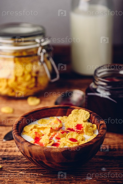 Завтрак с кукурузными хлопьями, молоком и ягодным сиропом