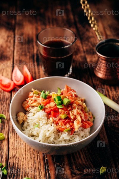 Яичница-болтунья с помидорами, свежим луком-пореем и белым рисом