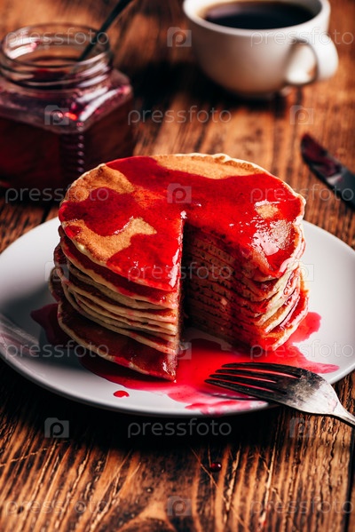 Стопка американских блинов с джемом из красных ягод