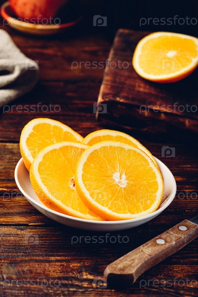 Дольки апельсина на белой тарелке