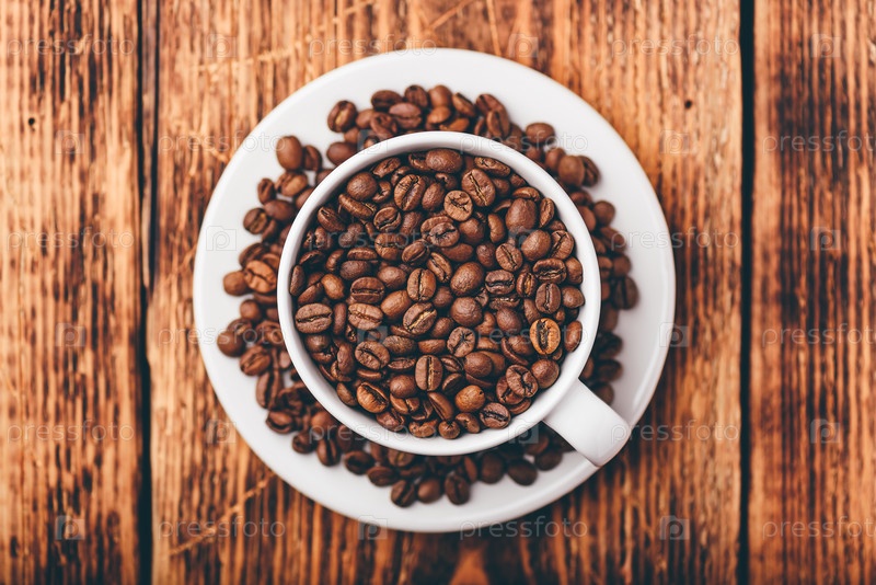 Белая чашка, полная жареных кофейных зерен