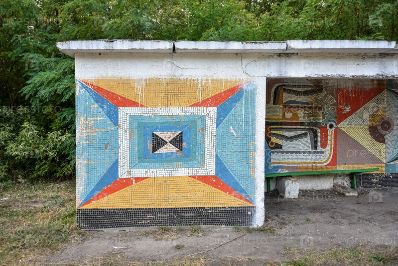 Автобусная остановка с фреской на стене