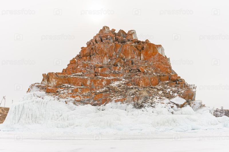 Небо облачное, солнце садится, создавая угрюмую атмосферу. Вид на гору Шаманка, озеро Байкал зимой