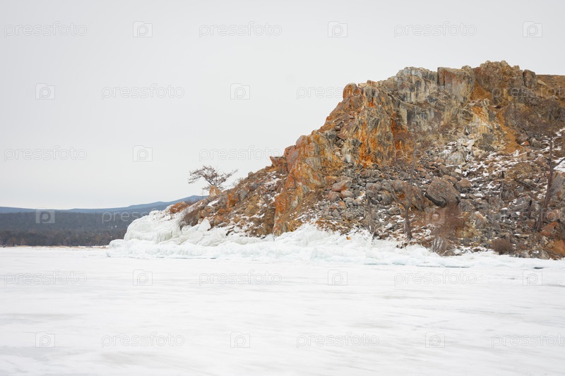 Небо облачное, солнце садится, создавая угрюмую атмосферу. Вид на гору Шаманка, озеро Байкал зимой