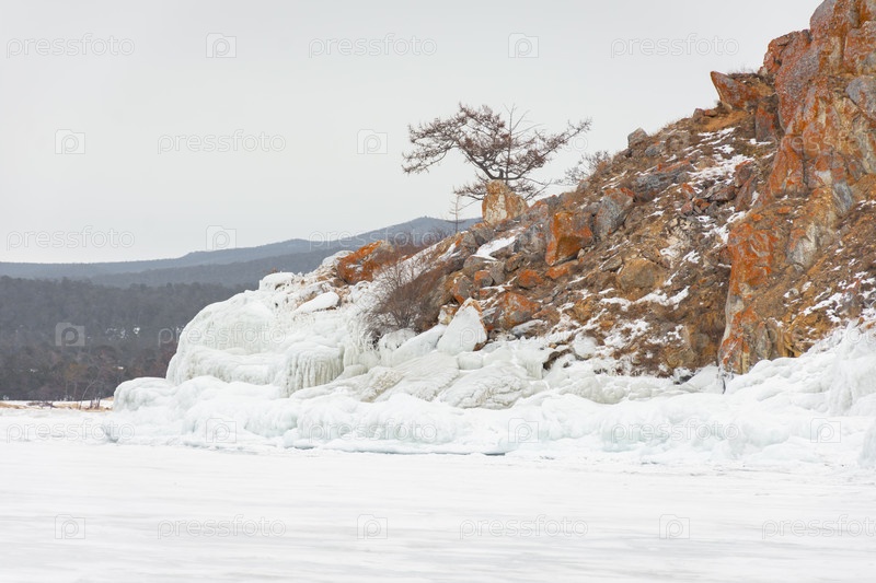 Небо облачное, солнце садится, создавая угрюмую атмосферу. Вид на гору Шаманка, озеро Байкал зимой