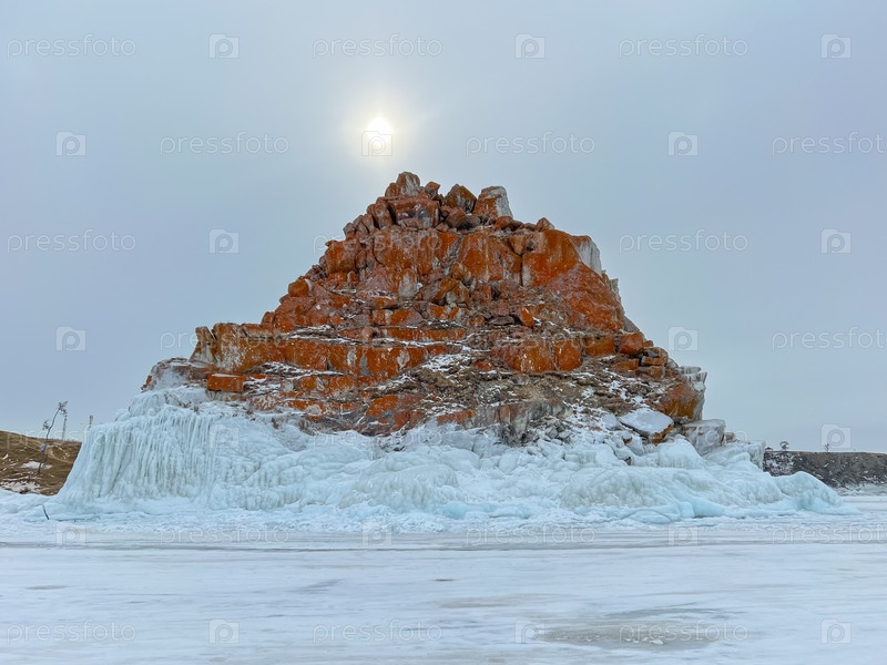 Небо облачное, солнце садится, создавая угрюмую атмосферу. Вид на гору Шаманка, озеро Байкал зимой